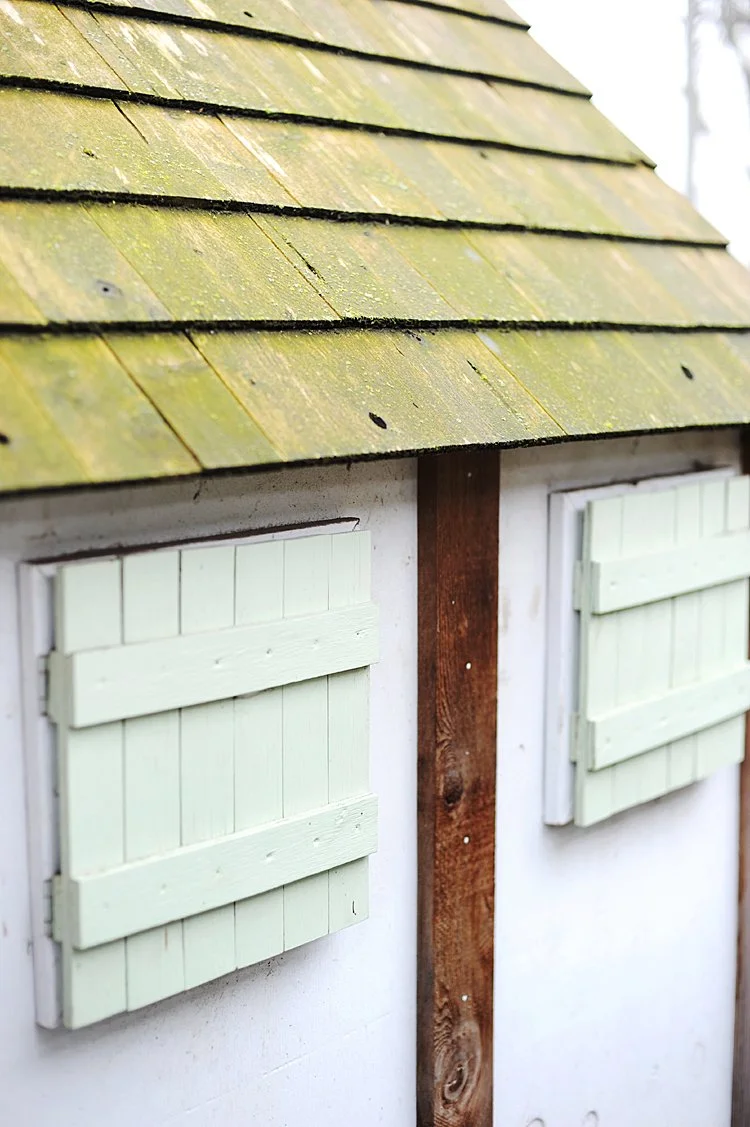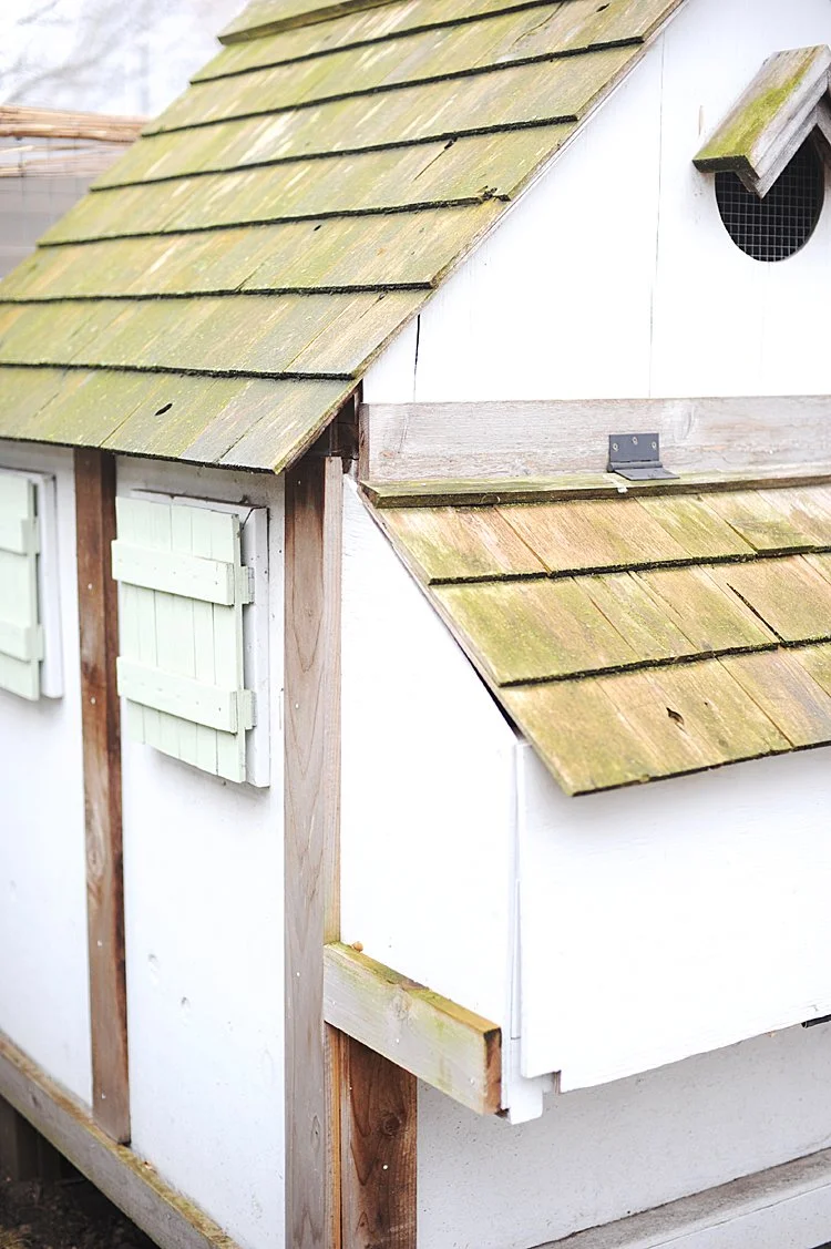 About 9 years ago I built our chicken coop all by myself with the only power tools being a drill & jigsaw! The only experience I had in building anything large out of wood was when I was a teenager & I built my cat a tower. I wanted chickens so bad that I wasnโt willing to wait until we moved out in the country! I went a little overboard on the design, because I wanted it to look like an English/French cottage. I saved a whole bunch of designs I wanted it to look like then drew up my own design to create. It took me all winter building it indoors then we brought it home, I built an attached run, & we bought some chicks a few months after that. I created circular air vents in the top sides right next to where they roost at night so they could have plenty of airflow, a cedar shake roof, little framed roof on top of the vents, wooden shutters that open, & a rope pulley for the door that lets them out in the morning! It was so fun building this - it definitely inspired me to do more building projects. Now if we ever move weโre going to have a problem taking this with usโฆ